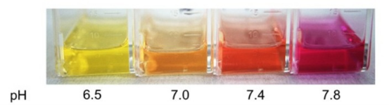 As cells grow, their metabolic by-products change the pH, which in turn changes the color of the medium. At lower pH values, phenol red turns yellow, and at higher pH values, it turns purple. For most culture systems (pH 7.2 to 7.4), the medium should be bright red. Some special media do not include phenol red, especially for estrogen-sensitive breast tissue cells, as phenol red can mimic steroid functions and affect cells.